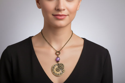 Antique Bronze Clock Necklace - Purple Glass Bead Chain Necklace 26 Inches