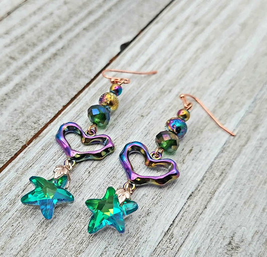 Ion plating Heart crystal peacock star Earrings 2.5inches