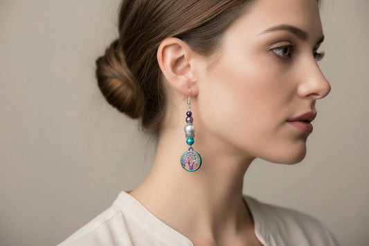 Tree of Life Earrings - Glass Bead Dangle Earrings with Hematite Accents