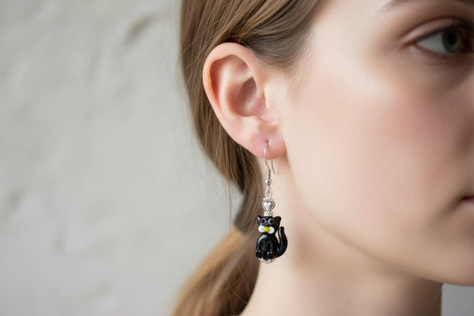 Black Lampwork Cat Earrings - Handmade Glass Bead Earrings