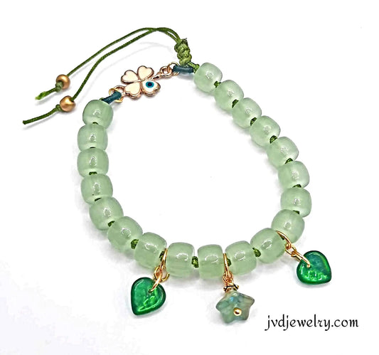Green adjustable beaded Bracelet Evil eyes 4 leaves