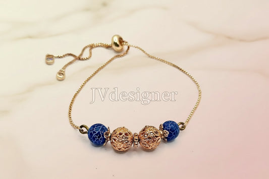 Gold Blue Agate Bracelet Adjustable | Antique Filigree Beads 10.25" | Handmade Jewelry