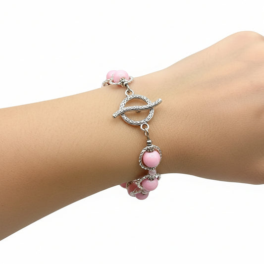 Pink Glass Pearl Bracelet - Silver Toggle Clasp | Adjustable 6-7.75"