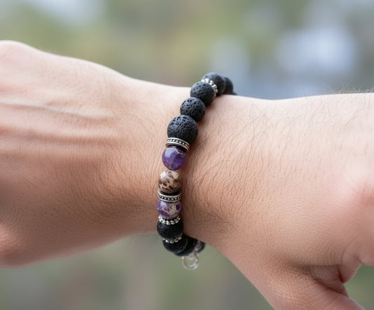 Unisex Black Lava Bead & Gemstone Bracelet - Stretch Design | 7.75 Inches
