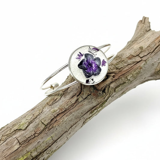 Purple & Black mix Silver adjustable Resin flower handpainted Bracelet