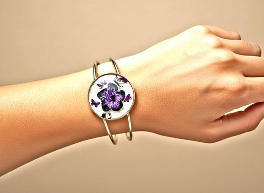 Purple Black Resin Flower Bracelet Adjustable | Handpainted Clay Butterfly Silver | Unique Jewelry