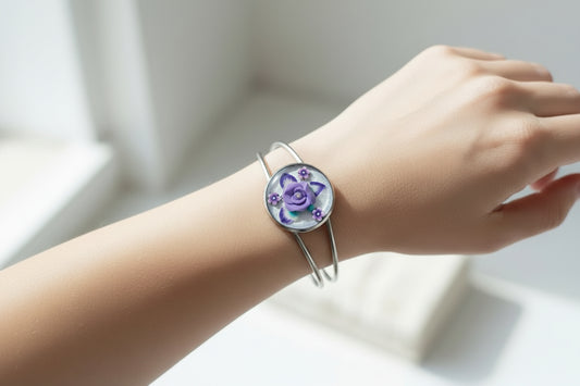 Purple Flower Bracelet Adjustable Silver | Handmade Clay Resin Artisan Jewelry | JVDesigner