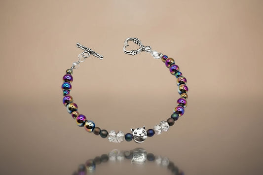 Silver Cat Hematite Bracelet Wire Wrapped | Crystal Heart Toggle 6.5"+ | Handmade Jewelry