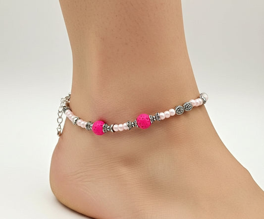 Pink Lava Bead Anklet – Handmade Stretch Ankle Bracelet with Glass Beads