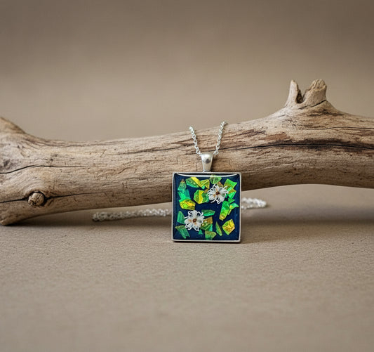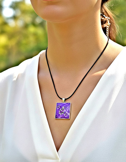 Silver square bezel handcrafted iridescent resin gall Necklace