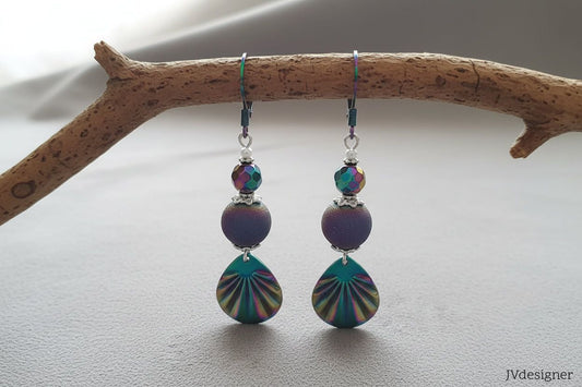 Rainbow Crystal Dangle Earrings - Purple Glass Bead Earrings with Iridescent Spike Drops