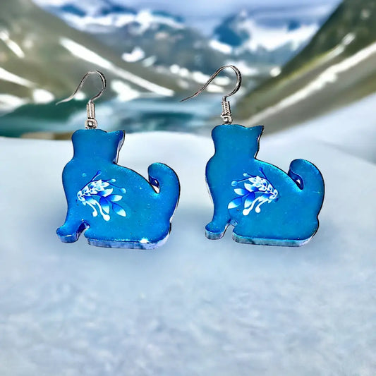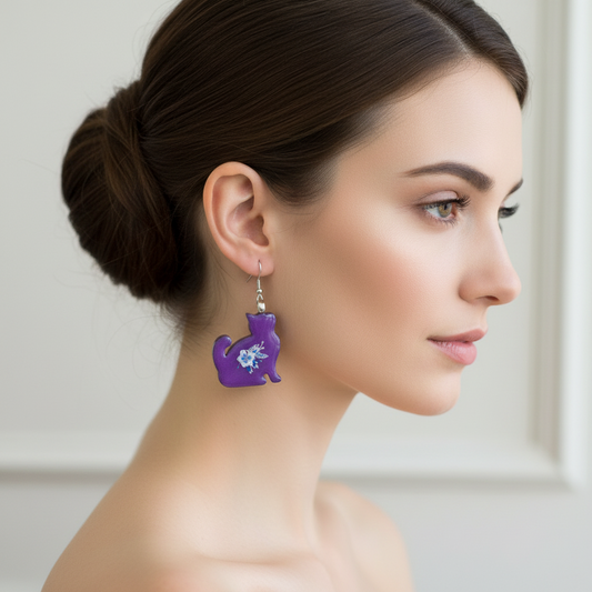 Resincrete Cat Earrings purple iridescent white flowers 2"x1"