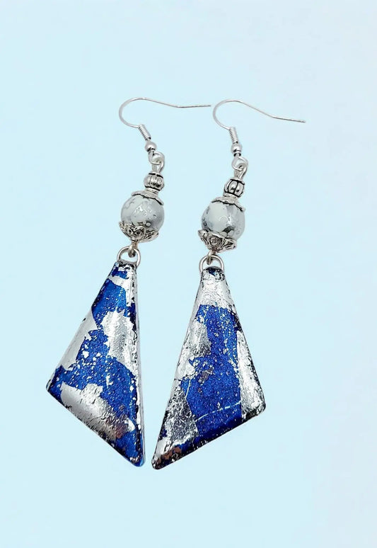 Resincrete Silver Paperfoil blue dangle Earrings 2.75"