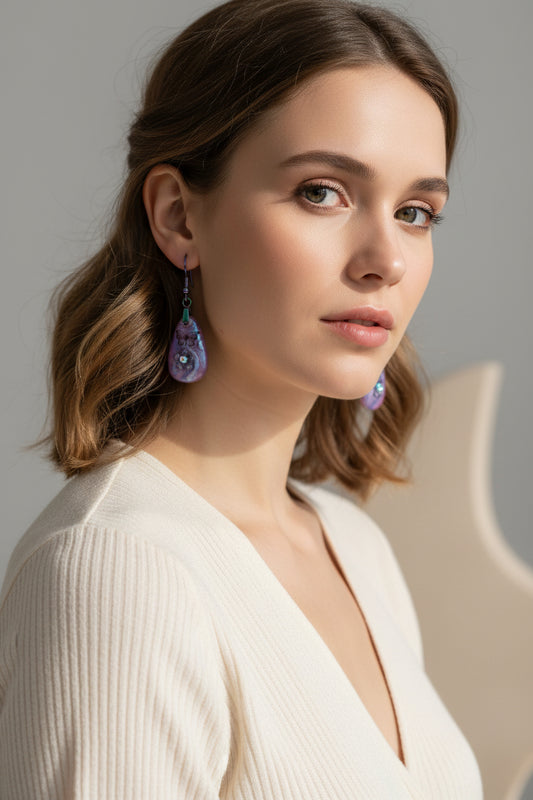 Our earrings feature premium materials including Czech glass beads, lampwork glass, natural gemstones, resin-crete, and high-quality findings. All ear hooks are hypoallergenic, available in silver-plated, stainless steel, or titanium options for sensitive ears.