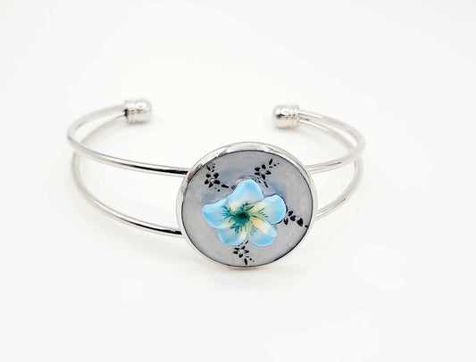 Bracelet manchette fleur en polymère bleu artisanal réglable