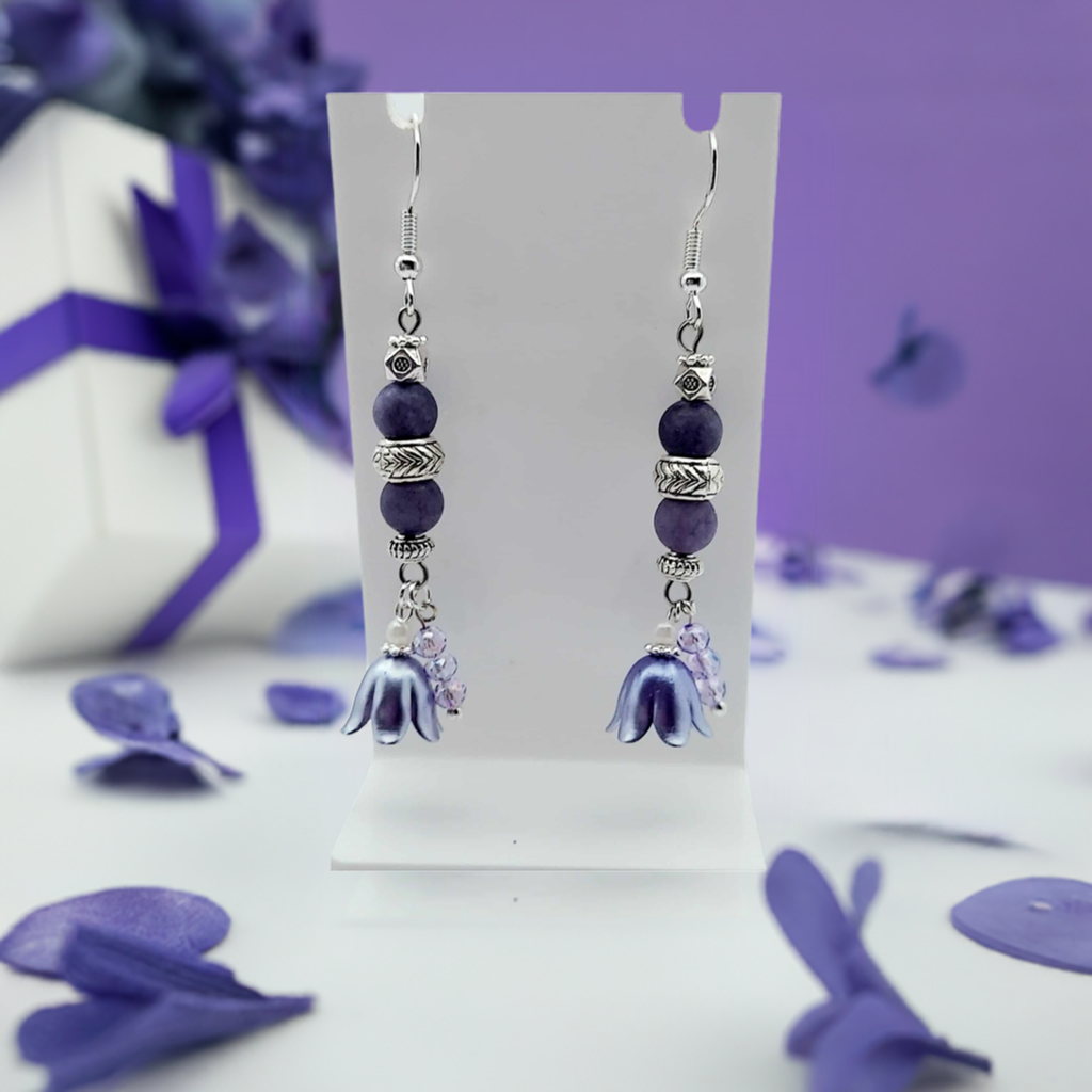 Elevate your style with these stunning Acrylic flower Cala lily purple Gemstones Earings! Featuring 2.25 inches of vibrant purple gemstones, silver-plated daisies, and silver spacer beads, these earrings are the perfect accessory to add a touch of elegance and charm to any outfit. Embrace the beauty and versatility of these earrings and let them take you from day to night with ease.