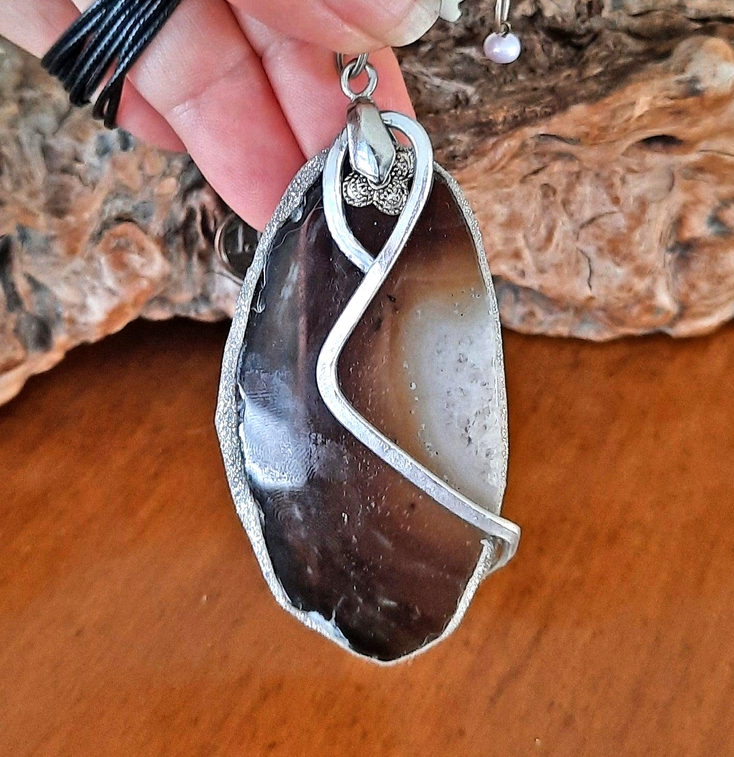 This Agathe pendant necklace features a double-strand black cord measuring 30 inches with an additional 2.5-inch extension for adjustable length. It is secured with a silver lobster clasp and showcases a stylish Agathe pendant enhanced by a silver bail and subtle silver accents, combining elegance with versatility for everyday wear.