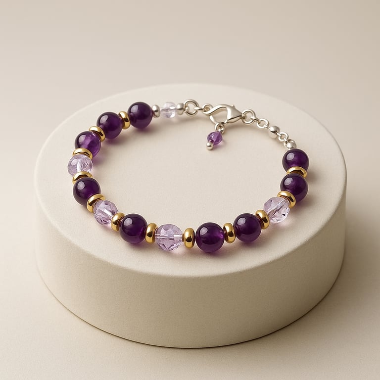 Luxurious Amethyst Purple Stone Beads with a hint of sparkle from gold roundel spacers and AB lavender faceted crystals. Complete with a silver extension, JVD silver tag, and a secure silver lobster clasp for an elegant finish.