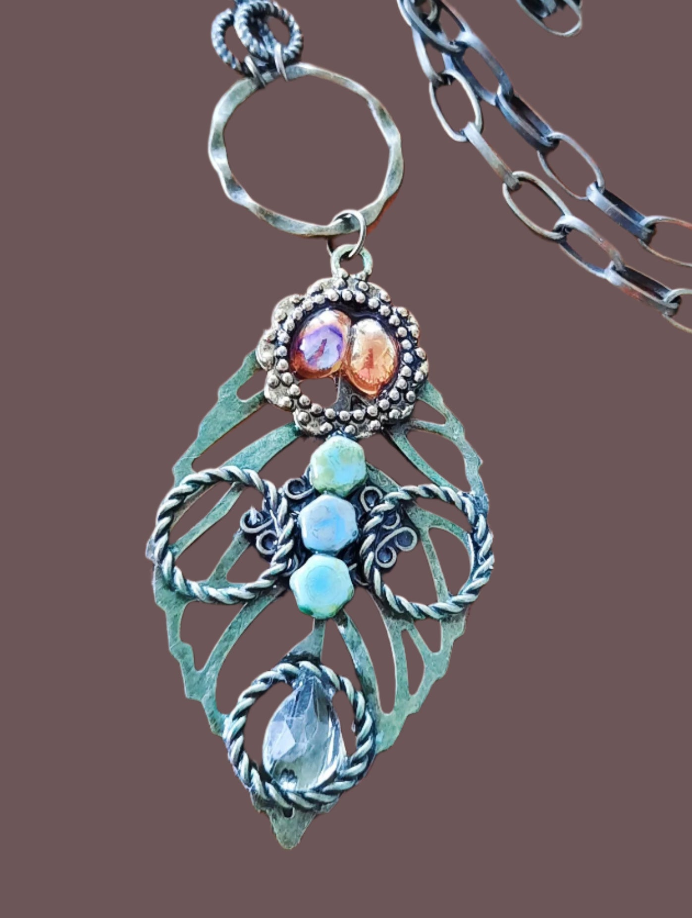 This statement-making necklace features a 24-inch, non-clasped chain and a 2.5-inch pendant of intricately crafted filigree leaf design and sparkling crystal components, handcrafted by Josee.