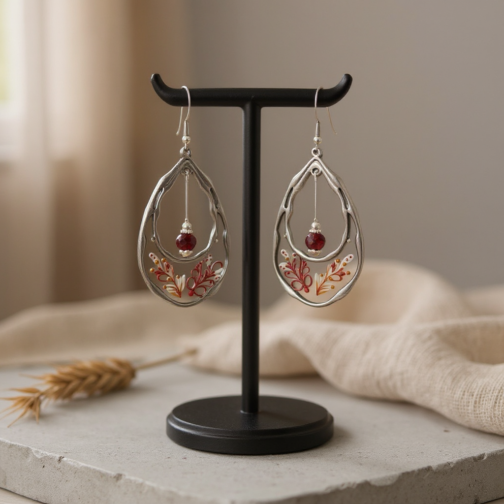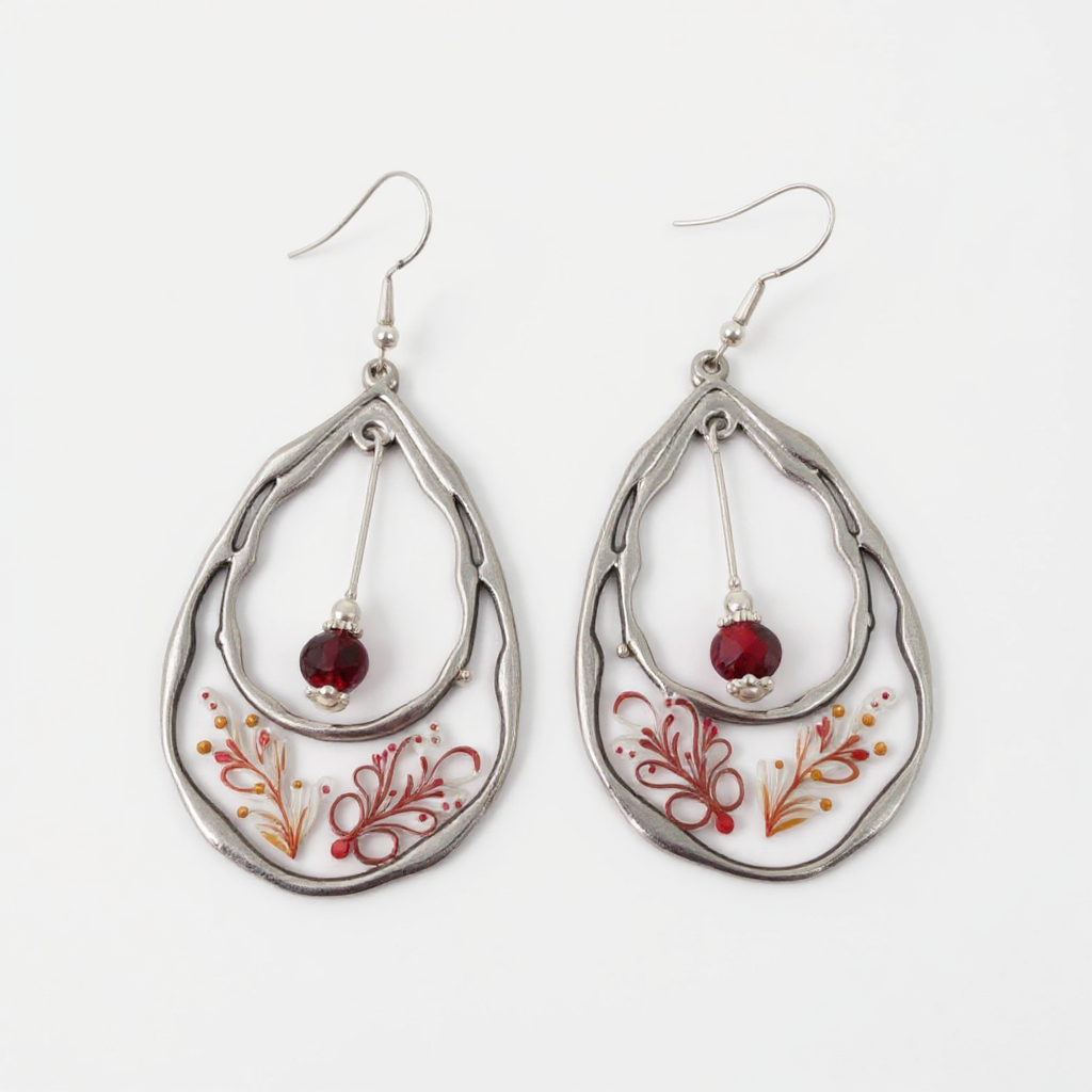 These dazzling silver drop hoop earrings feature vibrant red crystal beads and delicate resin flowers, measuring 2.5 inches in length. Crafted with resin and crystal elements, they add a striking touch of elegance to any outfit.Silver - plated French hooks.