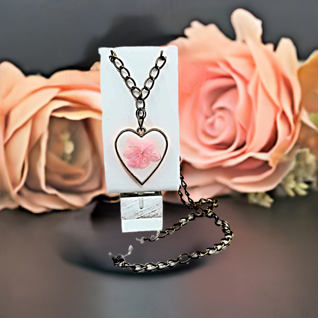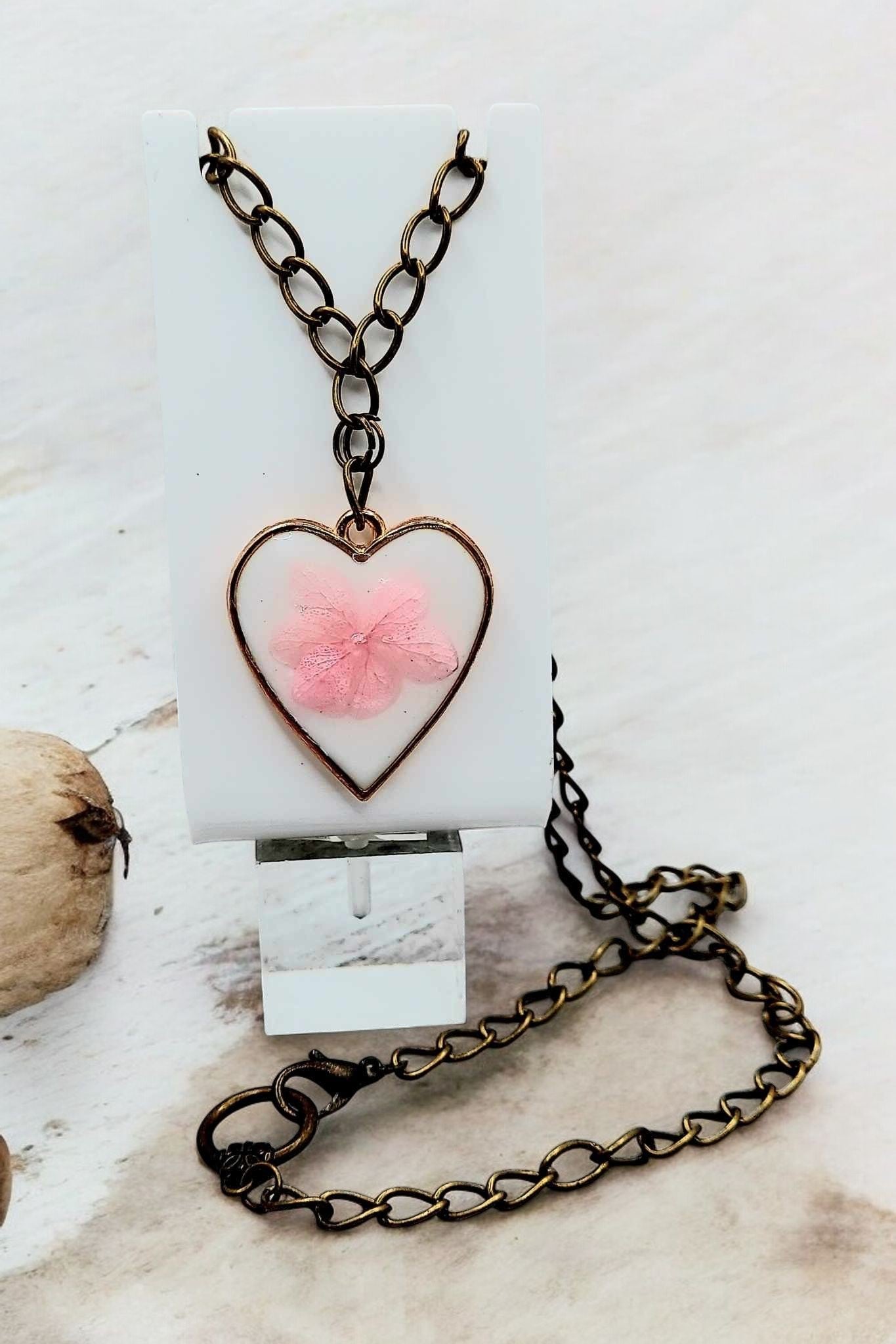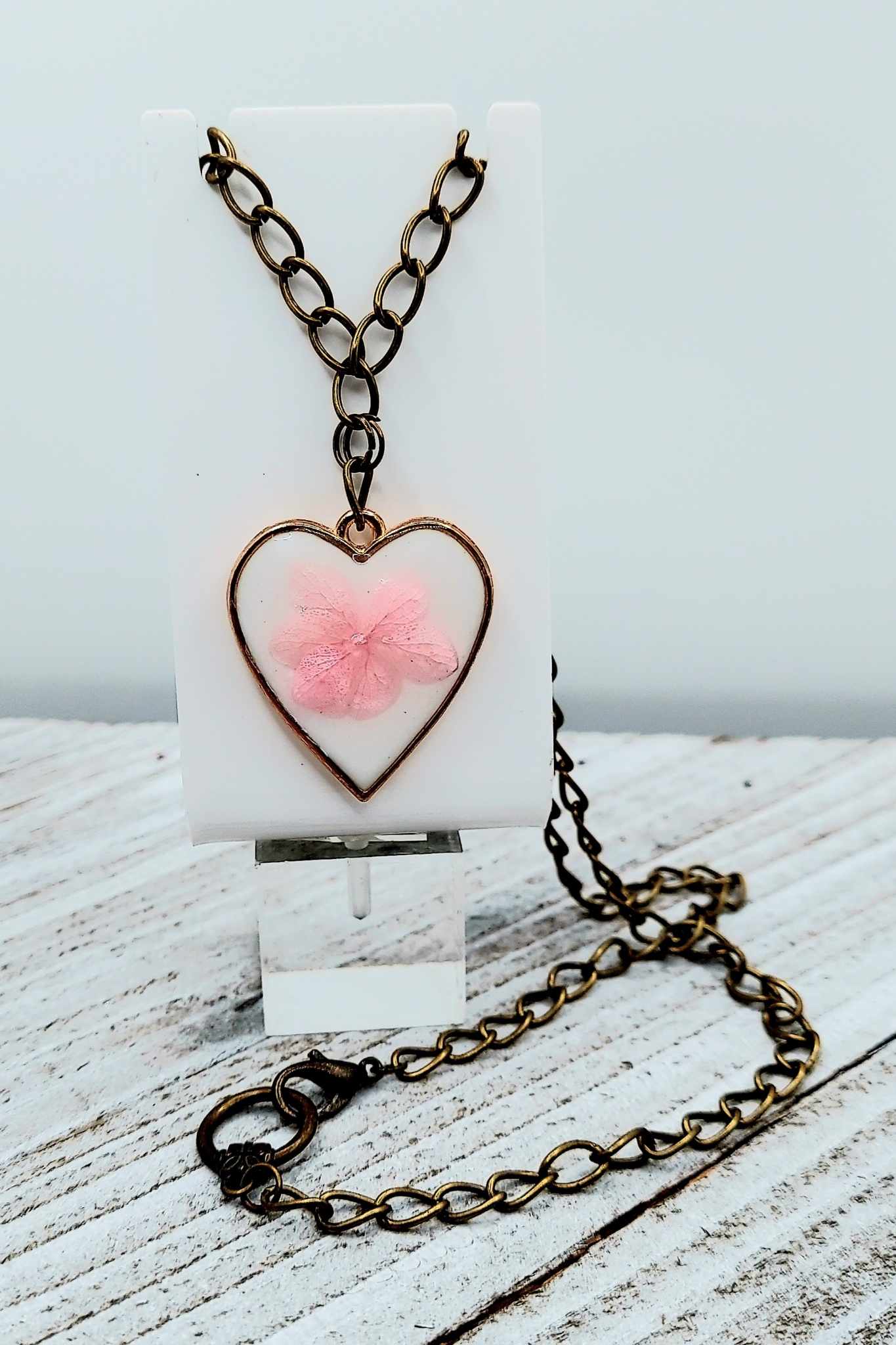 Be still, my beating heart (necklace). The ultimate jewelry statement piece (and conversation starter) that adds a touch of whimsy to any outfit. It's handcrafted with a soft pink, flower-filled heart made from resincrete. And with a lobster clasp, it's both easy to put on and secure to wear all day (or night) long.