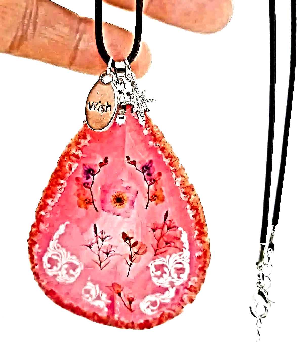 This exquisitely handcrafted necklace will make you feel glamorous and unique. Boasting a beautiful pink agate slice, this necklace features two silver charms inscribed with wishes, a black cord with a lobster clasp that can extend up to 21 inches, and intricate details that will turn heads. Elegantly crafted to be exclusive and luxurious, it's a perfect accessory for any modern fashionista.