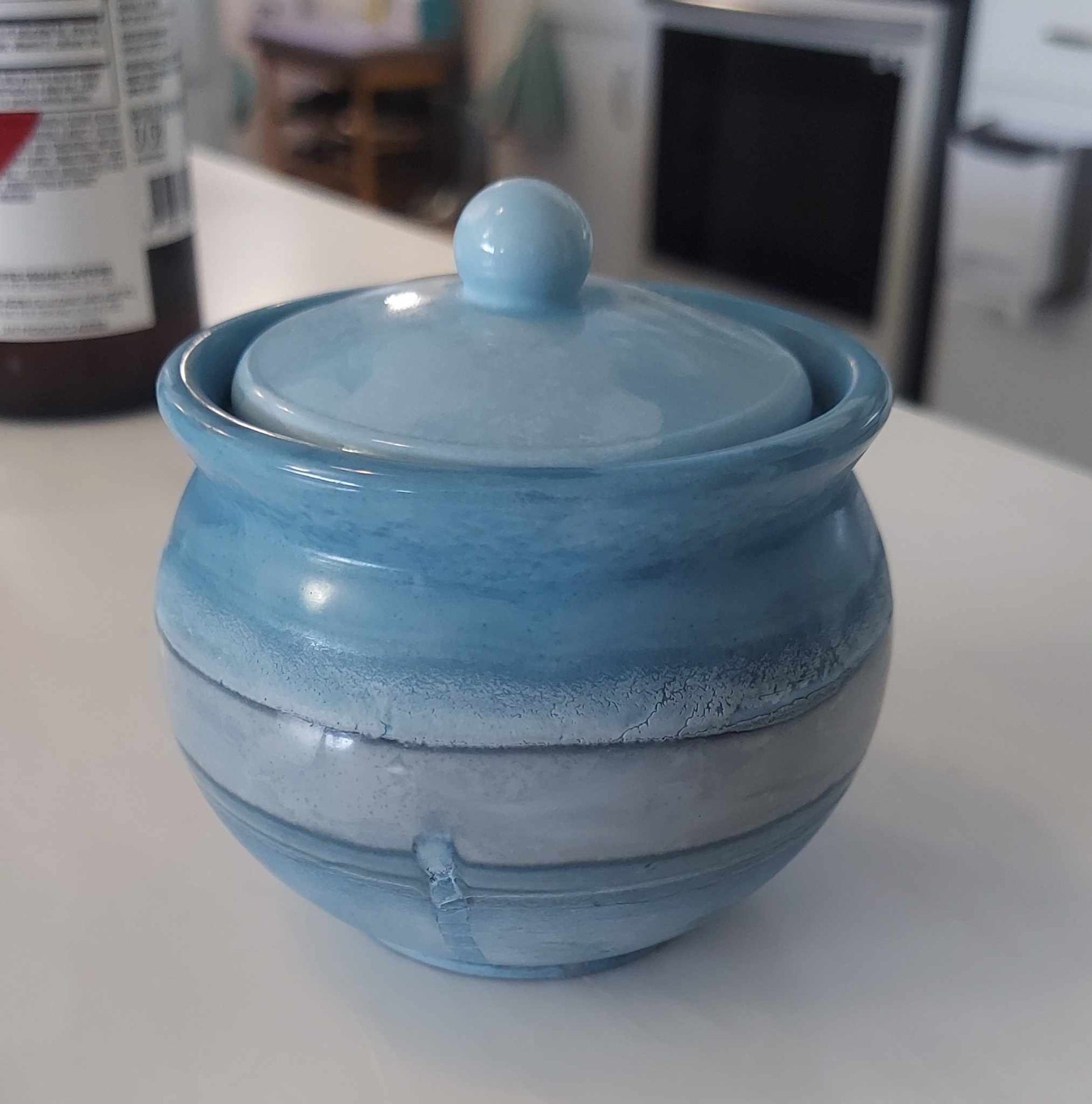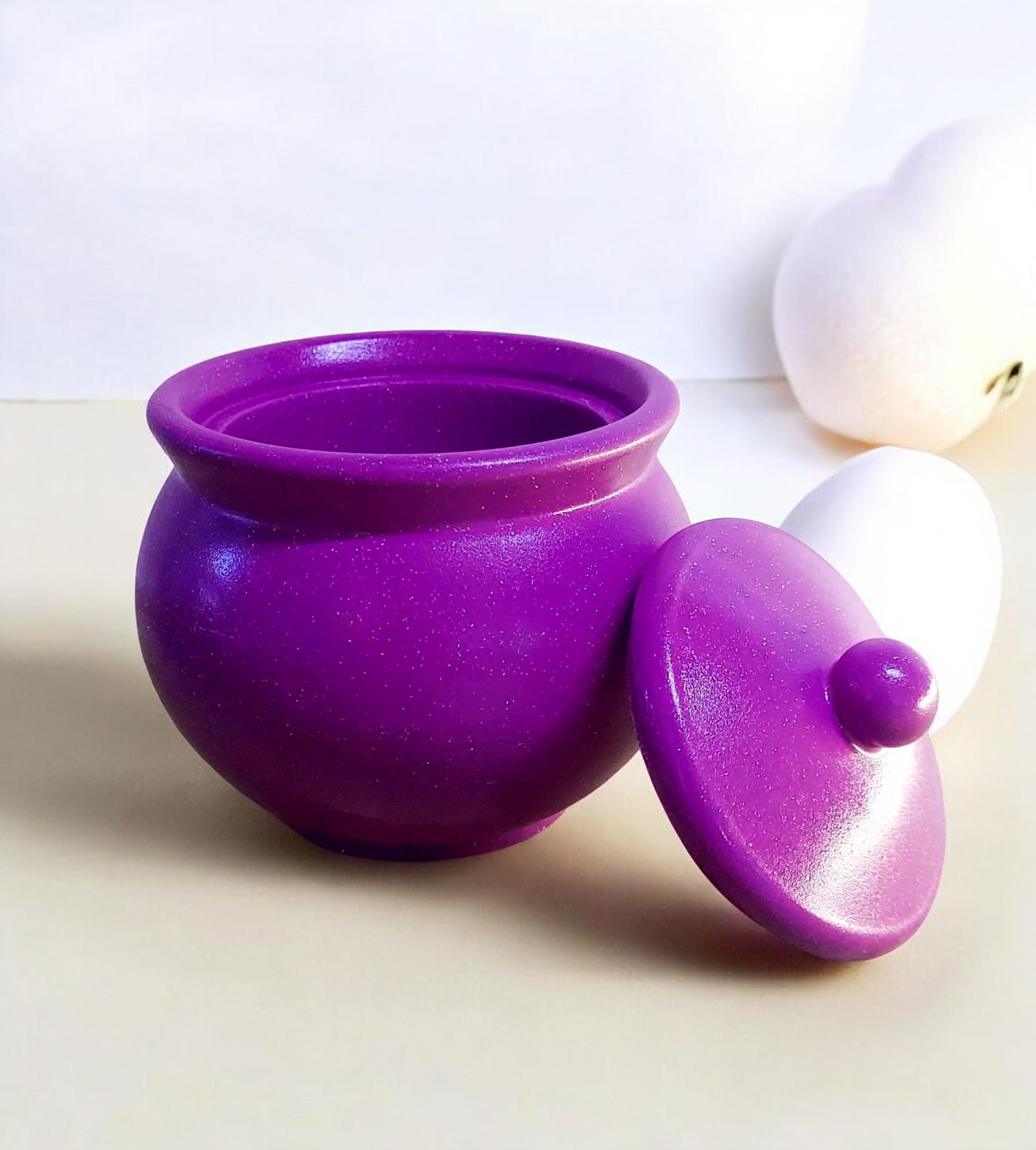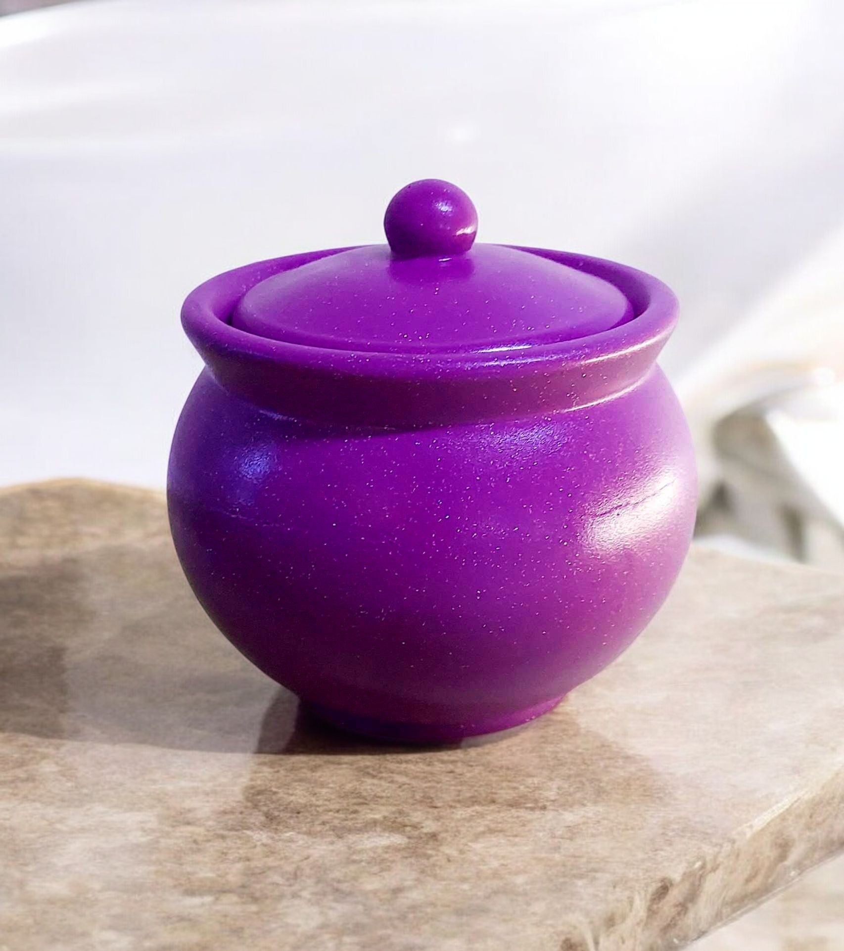 Elevate your vanity or desk with our handmade Resincrete Trinket Jar. Its lustrous purple finish and speckled texture make it a one-of-a-kind addition to your space.
