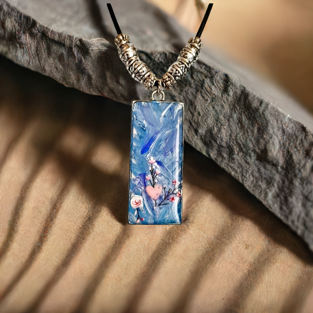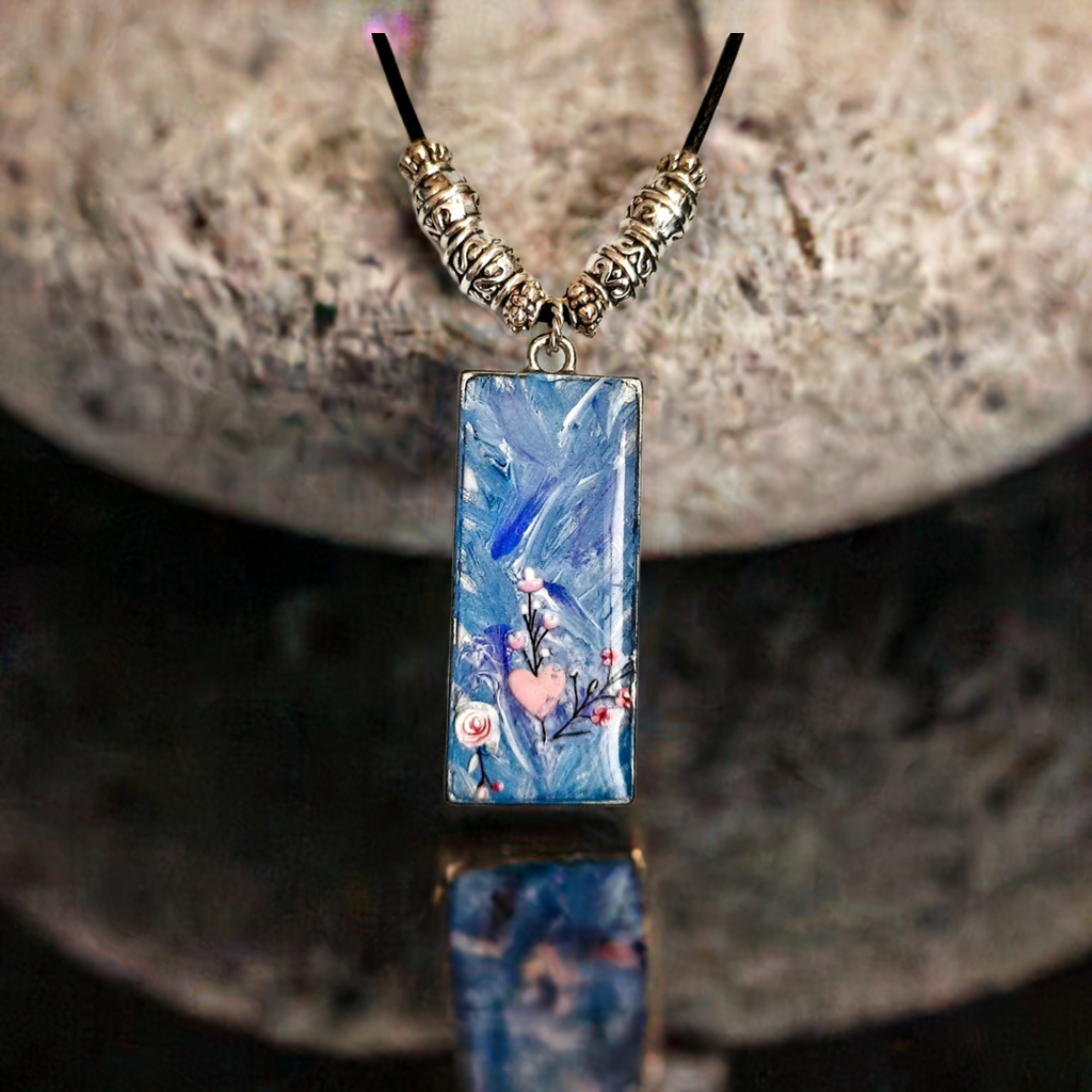 Transform your look with this unique, handpainted necklace! It's crafted with a stunning black cord and accented with shimmering silver beads and a secure lobster clasp. With its mesmerizing blue and pink resincrete design, this necklace is truly one of a kind and will add a touch of artistry and elegance to any outfit. Whether you dress it up or down, you'll be sure to stand out with this one-of-a-kind piece. Order now and experience the beauty and quality of a handcrafted necklace!