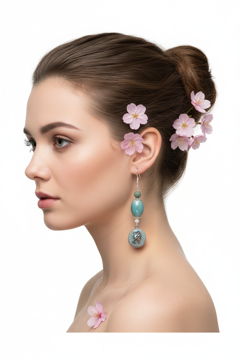 These earrings are more than just accessories - they're a celebration of your love for cats. The handcrafted clay kitty adds a whimsical touch, while the teal glass beads bring sophistication. Lightweight and comfortable for all-day wear, they make the perfect gift for cat enthusiasts or a special treat for yourself.