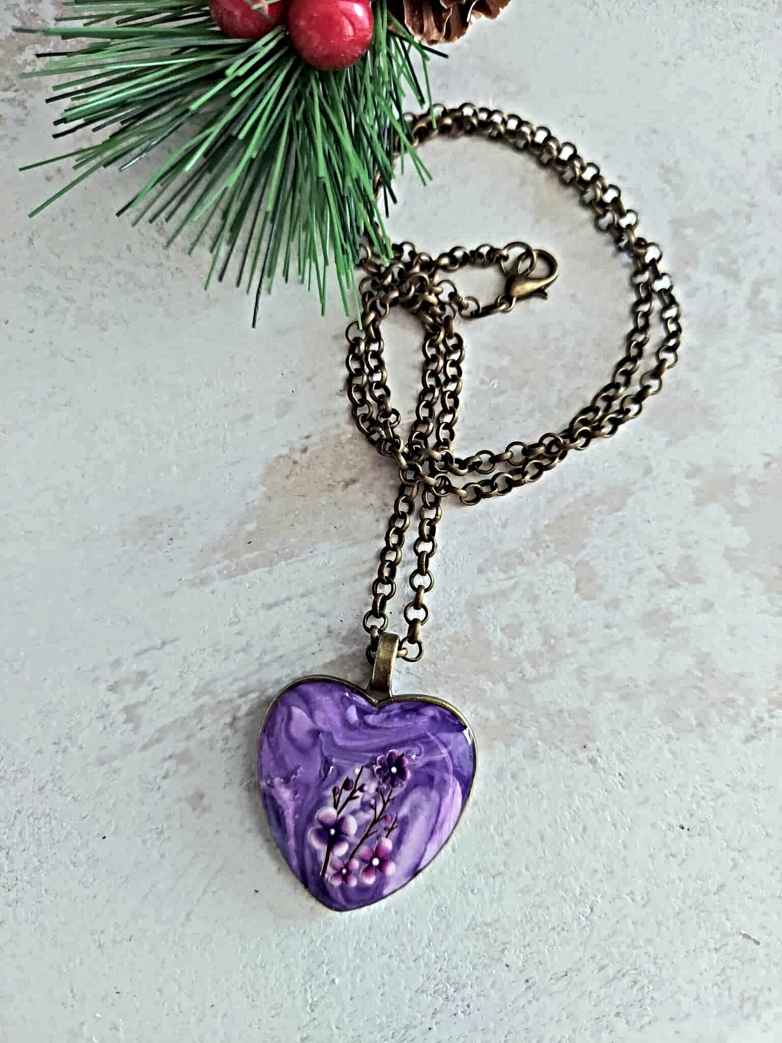 Elevate your everyday style with this enchanting heart-shaped pendant necklace, featuring delicate floral details crafted from purple clay resin. The 20-inch antique bronze chain length offers versatile wear—perfect for layering or wearing solo as a statement piece. This lightweight, artistic accessory brings a touch of nature-inspired elegance to any outfit, making it an ideal choice for those who appreciate unique, handcrafted jewelry that stands out from the ordinary.