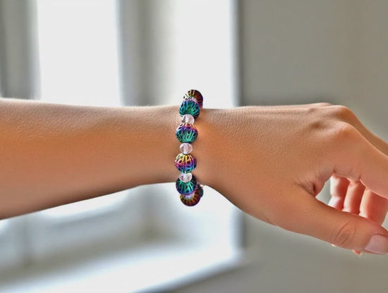 This handcrafted bracelet combines delicate filigree metalwork with the gentle beauty of lavender glass. The rainbow ion plating catches the light beautifully, creating a subtle color shift that complements any outfit. Whether you're dressing up for a special occasion or adding flair to your everyday look, this bracelet brings effortless style.